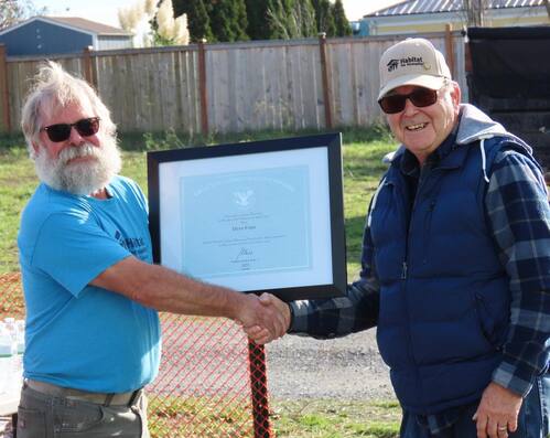 Lauren Taffer, who is the Marketing and Communications Manager for Habitat for Humanity of Island County, unmasks our secret but celebrated volunteer. Dean Faris received this tremendous surprise (and honor) last Saturday, the Presidential Lifetime Achievement Award, for volunteering 4,008 hours with Habitat for Humanity of Island County. Lauren says,